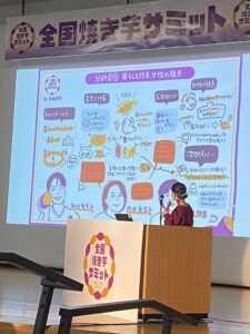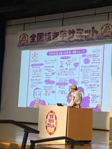 焼き芋サミットでは、各分科会の様子をそれぞれグラフィックレコーダーが分かれて、準備し、全員が戻ってきた際にそれぞれの分科会ではどういう話があったかをグラレコを持ちいて説明する、という使い方をしていただいております。
